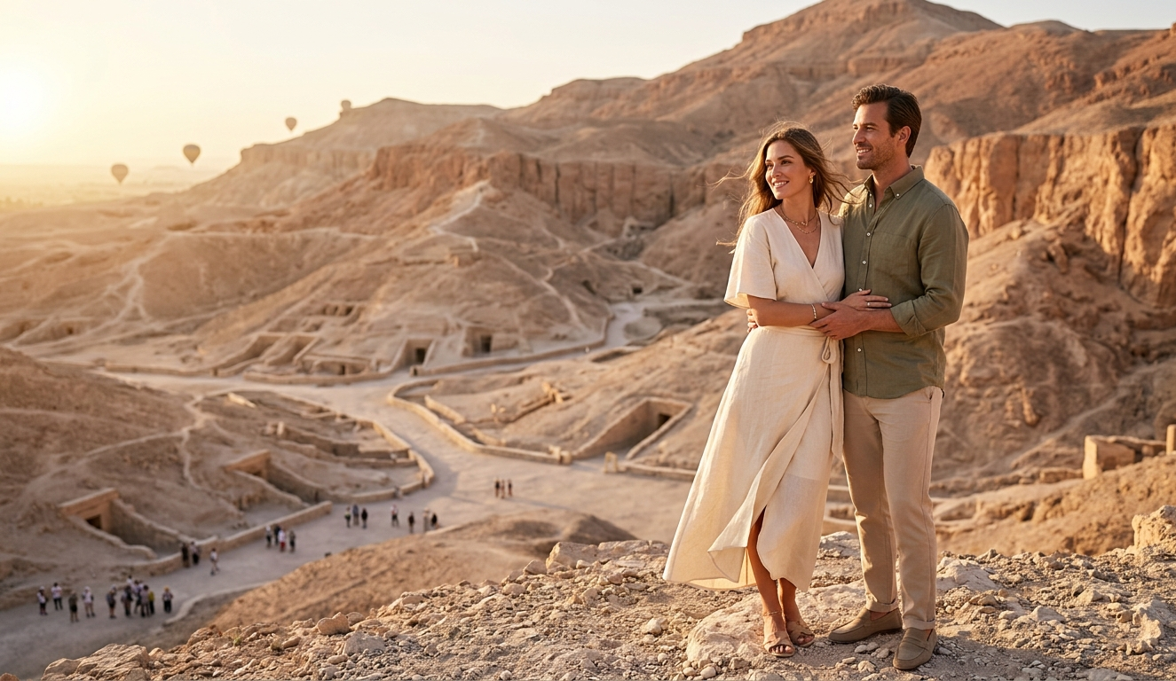 Begin your morning with breakfast at the hotel, then meet your private tour guide, who will escort you to the station to board a first-class train to Luxor. Upon arrival, your romantic honeymoon continues as you explore some of Egypt’s most magnificent ancient wonders. Valley of the Kings Tucked within the Theban Necropolis, this legendary valley is an underground treasury of royal power and splendor. Home to around 63 tombs, it served as the eternal resting place for pharaohs, queens, and nobles of the New Kingdom (1570–1050 BC), spanning the 18th to 20th dynasties. Among its most celebrated tombs are those of Tutankhamun, Hatshepsut, Seti I, and Ramesses the Great, each preserving timeless secrets of ancient funerary ritual and artistry. Temple of Queen Hatshepsut Discover the enduring legacy of Queen Hatshepsut (1508–1458 BC) at her awe-inspiring temple, begun in 1479 BC under the direction of her architect Senenmut. Rising majestically from the cliffs of Deir el-Bahari, it honors Amun, the creator god, and features magnificent reliefs narrating her divine coronation and symbolic rebirth. Colossi of Memnon Standing guard at the entrance to ancient Thebes, these twin statues of Amenhotep III (1391–1353 BC)—carved around 1350 BC—each soar 18 m (60 ft) high. Inscriptions along their sides tell enduring tales of Memnon, his reign, and his sacred heritage. Lunch: Share a romantic lunch on a Nile Island, reached by a serene boat ride. Karnak Temple Continue to the awe-inspiring Karnak Temple, the largest religious complex ever built. Constructed between 1971 BC and 30 BC across the Middle, New, and Ptolemaic periods, it’s dedicated to the divine triad Amun, Mut, and Khonsu. Wander the monumental Hypostyle Hall, the grand Avenue of the Sphinxes, towering pylons, and sacred shrines—a golden masterpiece of architecture and devotion. At day’s end, check in to your 5★ Luxor hotel for a restful overnight stay. Meals: Breakfast, Lunch Overnight: Luxor Hotel